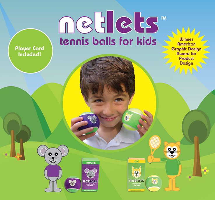 The Netlets balls for kids won an American Graphic Design Award for package design by Graphic Design USA. The balls were featured in the gift shop at the International Tennis Hall of Fame in Newport, RI, as well as countless tennis shop across the east coast.